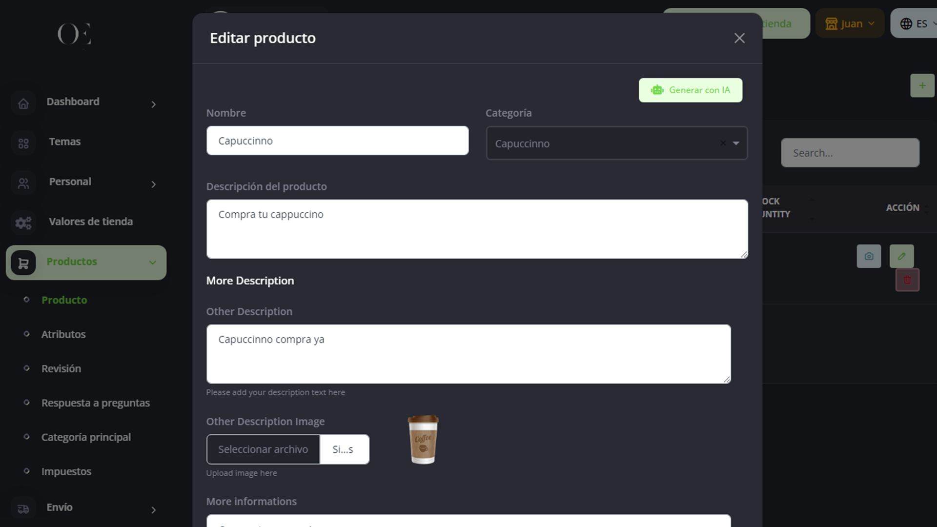 Diseña tu tienda online en segundos con ayuda de Inteligencia Artificial: ¡fácil, rápido y sin saber de programación! Carga tus productos, recibe órdenes, gestiona tus cobros y envíos, haz publicidad digital, y mucho más.